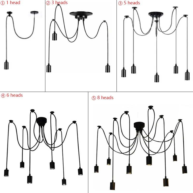 3. Works with LED/CFL/ Edison/Energy Saving/Incandescent Light Bulbs etc. Regular medium base e27 with 1/3/5/6/8/10 heads for option (Bulbs NOT included)